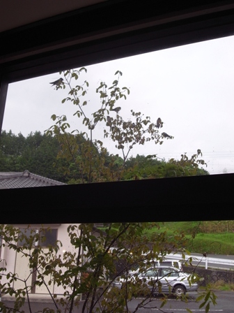 そして、雨の日は、なぜか店の植木にも止まってくれます。